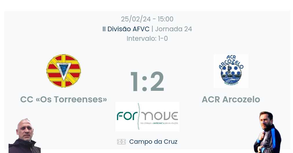 O futebol merece mais respeito num jogo fraco de ambas as equipas , perdemos aos 93 apenas futebol , qual o espanto quando assistimos no final do jogo a alguém que infelizmente não sabe estar neste desporto tão belo ! Parabéns ao melhor treinador dos meses da página desporto , um tipo bem educado com uma educação acima da média para todos os intervenientes do jogo , que siga este caminho que de certeza será sempre muito feliz pela boa educação no mundo do futebol . Declarações a página ! Assinado Cctorreense