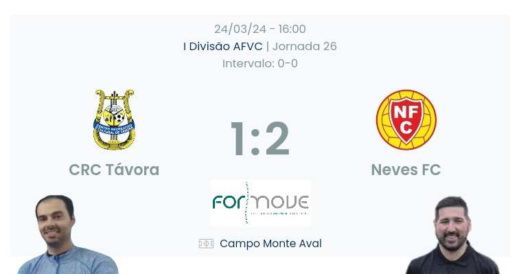 Jogo perfeito da nossa parte ,primeira parte jogo equilibrado, Távora com mais ascendente ,criava perigo pelas linhas e nós bem concentrados a defender ,na 2 parte foi diferente ,tinha alertado os meus jogadores para não acontecer os mesmos erros dos jogos da correlha e da ponte barca onde vanos para o intervalo empatados e bem organizados e a acontecer 2/as partes perssimas,eles entenderam e tudo fizeram que isso não tornasse acontecer , fizemos o golo logo ao começar a 2/a parte,a partir daí quem esteve presente no campo viu que o Neves criava oportunidades atras de oportunidades ,fizemos o 2/0 com naturalidade, reagiu o Távora e o golo apareceu,mas não nos pressionou ,uma equipa que vai em último e ter esta reação com seriedade e concentração ate final foi de louvar,as coisas não estão fáceis temos noção, enquanto tivermos vamos lutar como lutamos hoje,os jogadores dedicam a vitória á D. Filomena, homens ao sr armando e ao Presidente, agradecer aos adeptos presentes,e para terminar pedir aos adeptos o vosso apoio no próximo jogo em casa, cada jogo é uma final e estes jogadores precisam do vosso apoio. Excelente arbitragem.