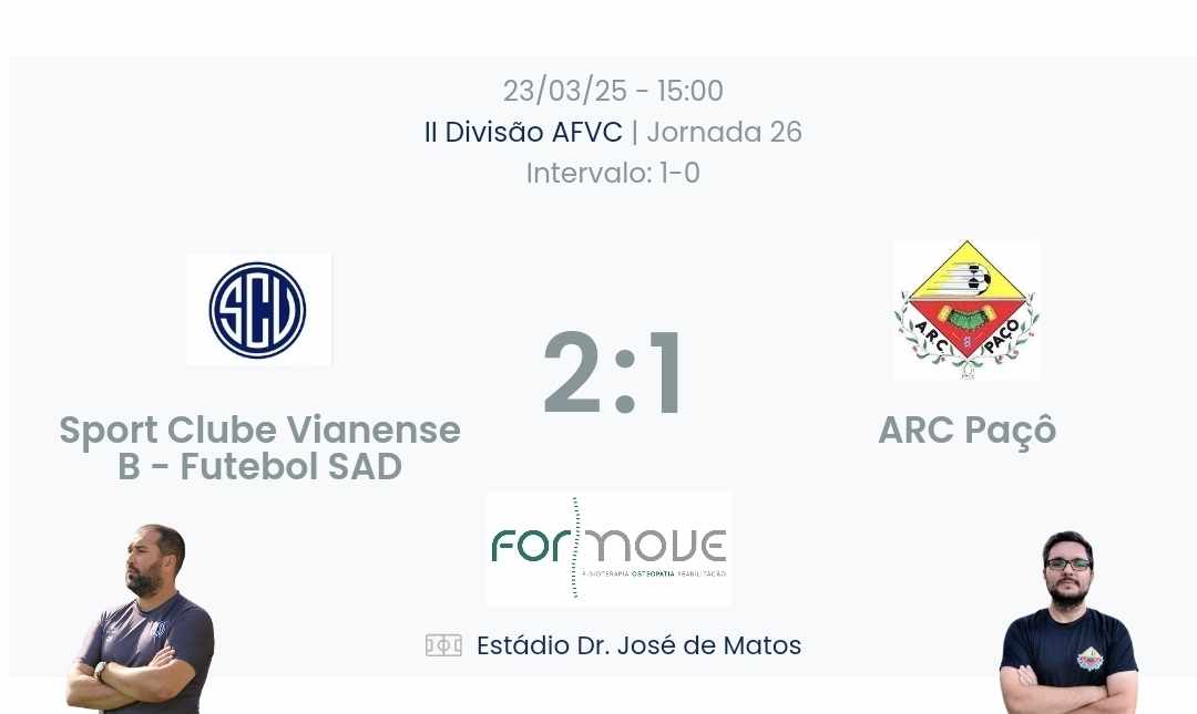 Jogo difícil,contra uma equipa jovem,com bons valores individuais e bem organizados.Embora na minha opinião a vitória não mereça contestação porque fomos a melhor equipa em campo e que criou mais oportunidades este foi um jogo em que tivemos dificuldades em pôr em prática o nosso jogo, estivemos ansiosos, muito precipitados,com muitos erros acumulados que não nos permitiram controlar o jogo como gostámos de fazer e assim o resultado esteve sempre em aberto até ao final fruto também da boa prestação da equipa do Paçô.Obviamente queremos sempre jogar bem e vencer mas entrámos numa fase da época que sabemos que acima de tudo o mais importante é vencer e manter os principais objetivos vivos.Agradecer mais uma vez a presença e o apoio dos nossos adeptos.Por fim e o mais importante,em nome de toda a equipa B do Sport Clube Vianense,envio aqui uma mensagem de força ao Samuel Cambão, alguém que trabalhou connosco durante a pré época e que embora tenha seguido outro rumo deixou no balneário fortes laços de amizade e neste momento difícil queremos que ele saiba que estamos todos a torcer por ele e que se Deus quiser em breve tudo estará de volta à normalidade.